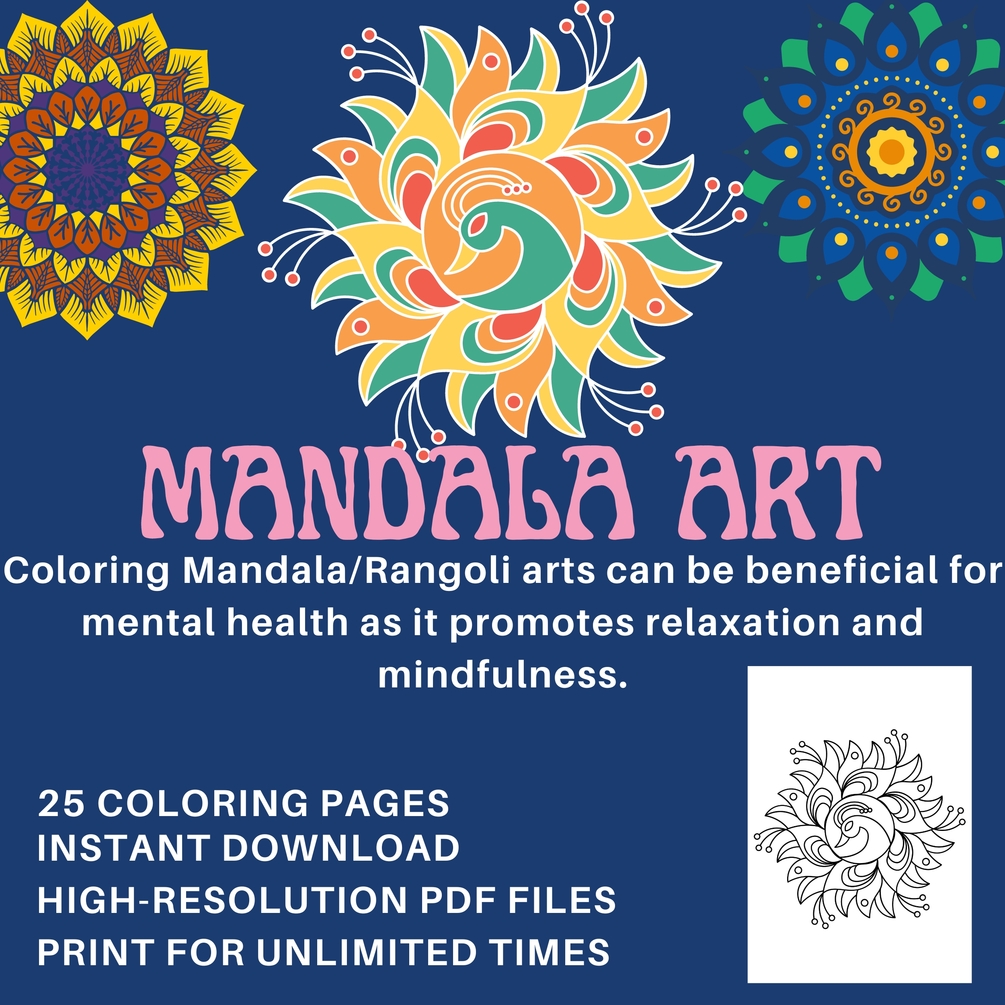 Coloring rangoli arts can be beneficial for mental health as it promotes relaxation and mindfulness. The intricate patterns and vibrant colors engage the mind, distracting it from stress and anxiety. The process of coloring fosters creativity and self-expression, providing a calming and therapeutic effect. Ultimately, it can serve as a meditative practice that enhances overall well-being.😊