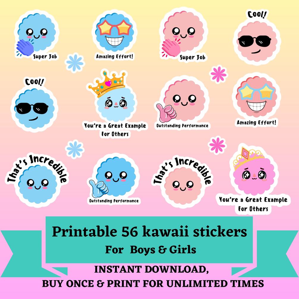 56 KAWAII REWARD STICKERS for kids, Printable stickers,Back to school png, Motivational stickers,Digital sticker pack,Sticker sheet for kids