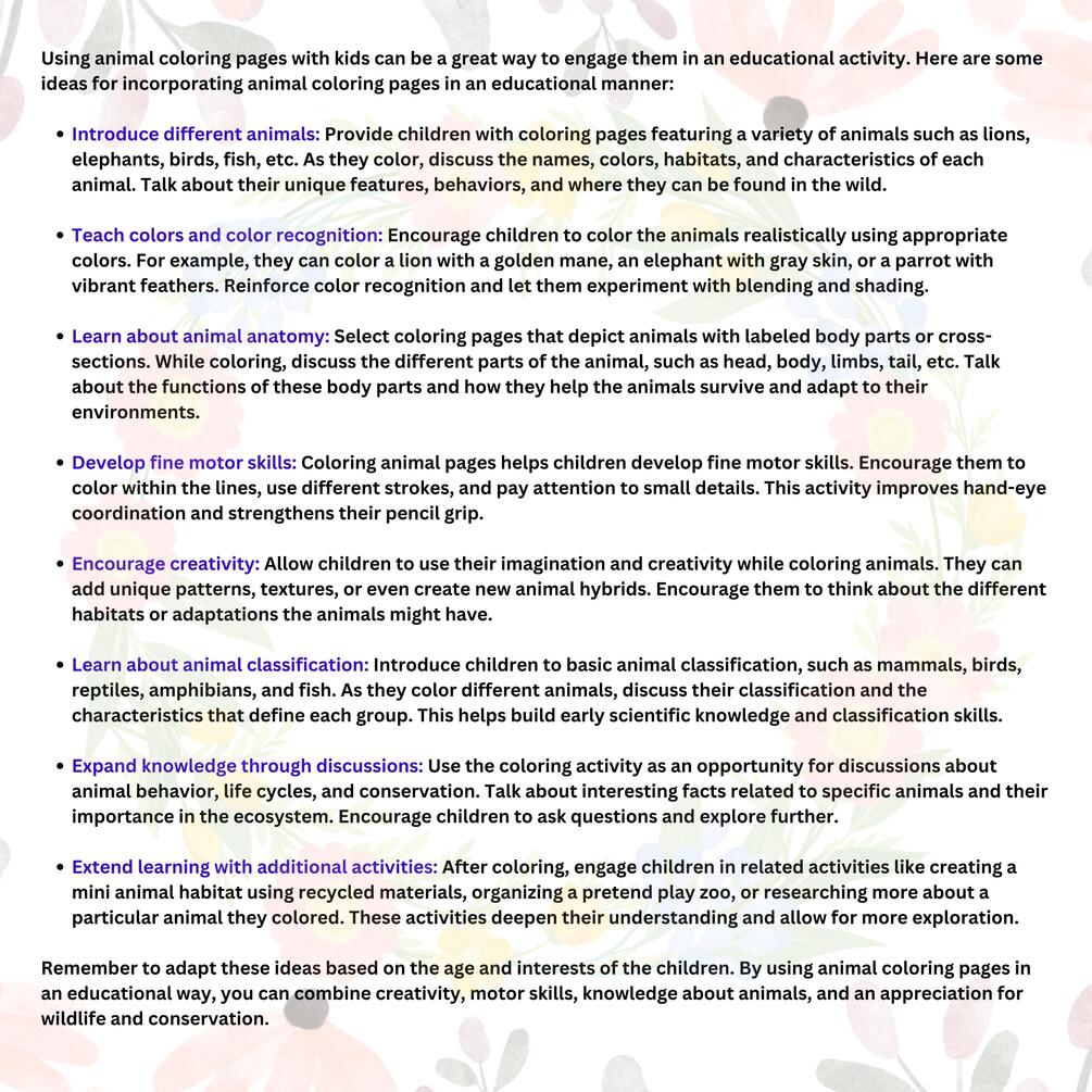 Animal coloring pages are important for kids as they foster creativity, encourage fine motor skills development, promote cognitive growth, and cultivate a sense of empathy and appreciation for nature's diverse creatures, all while providing a joyful and enchanting experience.😊